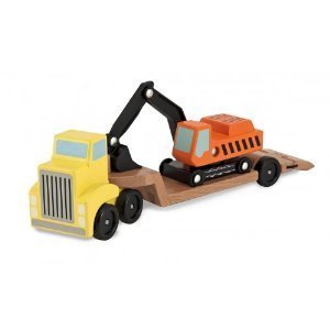 Melissa Doug Trailer, Hitch the trailer, load the excavator and roll out! As this tall yellow truck heads to the building site, the tough excavator stays in place on the grooved flatbed. Then the ramp comes down, the excavator rolls off . . . it's time to dig!